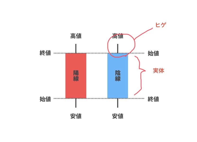 ローソク足は、『ヒゲ』と『実体』で形作られているという特徴があります。